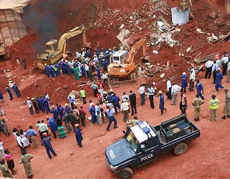 救援人員正在緊急清理廢墟,營救被埋工人。