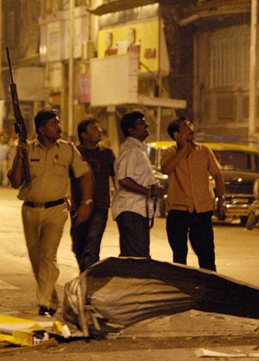 11月27日,警察在印度孟買戈拉巴街區(qū)的恐怖襲擊現(xiàn)場(chǎng)警戒。