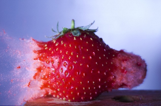 中新網(wǎng)3月26日電 據(jù)英國(guó)《每日郵報(bào)》報(bào)道,疾速飛行的子彈橫穿過(guò)草莓的瞬間會(huì)帶來(lái)怎樣的視覺沖擊?藝術(shù)家Alan Sailer使用氣槍、相機(jī)以及圖片編輯軟件,為我們呈現(xiàn)了這一瞬間的視覺盛宴。