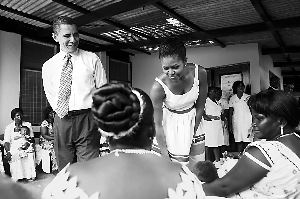 很多加納人對(duì)奧巴馬這位有著非洲血統(tǒng)的美國(guó)總統(tǒng)的到來(lái)持歡迎態(tài)度。這幾天,加納首都的主要街道被奧巴馬和米爾斯的畫像裝點(diǎn)得“非常熱鬧”。奧巴馬一家的大幅海報(bào)成為街頭小販兜售的“暢銷貨”。