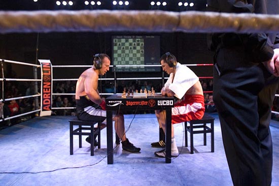 這個比賽結(jié)合了腦袋和拳頭的較量。比賽規(guī)則很簡單,先進(jìn)行4分鐘的國際象棋比賽,然后再進(jìn)行3分鐘的拳擊比賽,象棋和拳擊交替進(jìn)行,11個回合之后比賽結(jié)束。參賽者是否取勝要看是否能在擂臺上擊倒對手并在棋盤上將死對手。主辦者希望通過這個比賽證明,戰(zhàn)士可以成為智者,智者也可以是戰(zhàn)士。