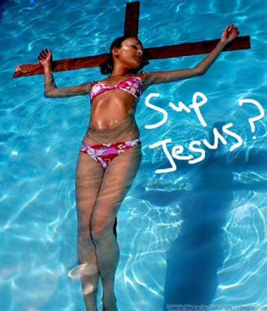 在其中一張照片上,她在游泳池中只穿著比基尼,躺在一個木的十字架上漂浮在水面,擺出耶穌基督受難時的經(jīng)典造型。在另有一張照片,她在一個的時尚表演中用舌頭舔煉乳,表現(xiàn)得十分狂野火辣。