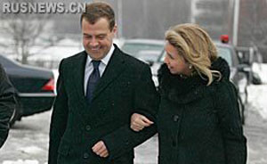 新一屆總統(tǒng)的熱門人選、俄第一副總理梅德韋杰夫偕夫人斯韋特蘭娜則在駐地附近的第二六一四號(hào)投票站出現(xiàn)。四十二歲的梅德韋杰夫投票后表示心情不錯(cuò):“春天已經(jīng)來了,雖說有點(diǎn)小雨,也是令人愜意的插曲。畢竟季節(jié)已經(jīng)變了!