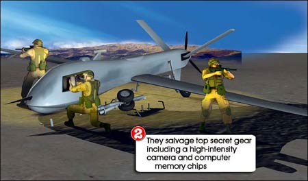 之后,隊(duì)員們沿繩索攀爬回直升機(jī),并用激光制導(dǎo)炸彈將偵察機(jī)引爆。