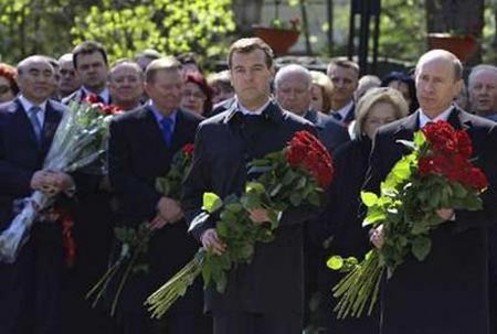4月23日,俄羅斯總統(tǒng)普京、當(dāng)選總統(tǒng)梅德韋杰夫,以及葉利欽家人出席俄前總統(tǒng)葉利欽墓碑落成儀式。(國(guó)際在線圖)