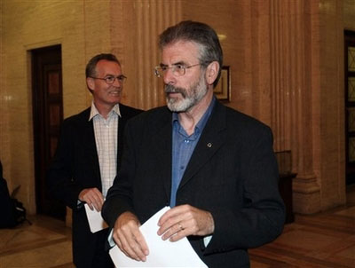 民主統(tǒng)一黨領(lǐng)袖佩斯利(左)和新芬黨領(lǐng)袖亞當(dāng)斯(右)共同出席記者招待會(huì)。