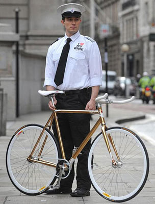 這輛自行車受英國環(huán)境運(yùn)輸協(xié)會(huì)委托定制而成,鏈條、座位、車把手都和普通自行車的一樣,不過表面卻鍍上了24克拉的黃金。由于在英國,售價(jià)超過4000英鎊的自行車都不能享受保險(xiǎn)“待遇”,因此購買這輛自行車的人還必須雇一位“保鏢”,在公共場合負(fù)責(zé)看管。