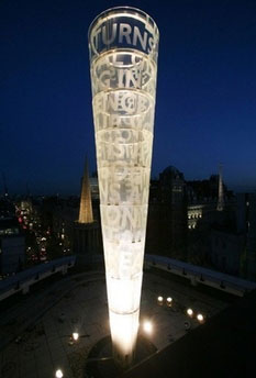 這座玻璃和鋼制成的圓錐形紀念碑位于英國廣播公司(BBC)大樓頂部,是在BBC的兩名記者早先分別在阿富汗和索馬里殉職后開始設立的。