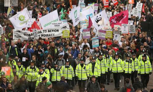示威者行經(jīng)國(guó)會(huì)大樓,吹響哨子,大喊“我們?cè)骱捭y行”,標(biāo)語(yǔ)五花八門(mén),有“人民為先、利潤(rùn)居后”、“離開(kāi)伊拉克和阿富汗”等,部分語(yǔ)句則較為激進(jìn),如“問(wèn)吊銀行家”、“沖擊銀行”。當(dāng)他們行至唐寧街的首相府時(shí),紛紛報(bào)以噓聲。