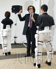 筑波大學(xué)教授山海嘉之(中)正在講解“機器人Suit HAL”如何幫助老年人及殘疾人。