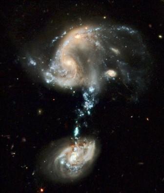被稱作Arp 194的星系群,圖片中出現(xiàn)的明亮的藍(lán)色彩帶,其實是新生藍(lán)色恒星向外延伸的完整的螺旋臂。當(dāng)兩個星系利用引力相互作用時,就會出現(xiàn)這種現(xiàn)象。
