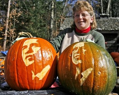 今年恰逢美國大選年,美國總統(tǒng)候選人奧巴馬和麥凱恩的造型受到了南瓜雕刻愛好者的追捧。另外,還有美國商家趁機(jī)雕刻了上千只造型各異的南瓜,等待萬圣節(jié)時擺上柜臺。