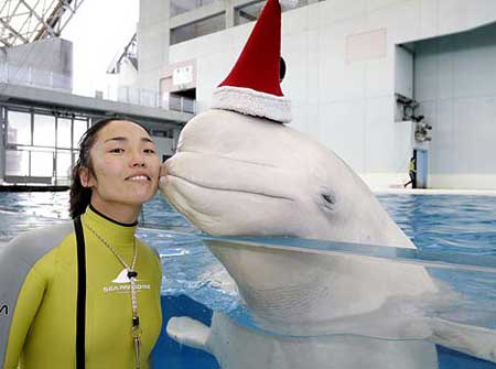 中新網(wǎng)12月19日 綜合媒體報(bào)道,由于圣誕節(jié)將至,日本橫濱八景島海洋樂園為了吸引更多的游客前來游覽亮出奇招,給館內(nèi)的兩頭白鯨戴上可愛的圣誕帽,前來游覽的游客甚至有機(jī)會得到這兩頭戴著圣誕帽的白鯨的親吻。