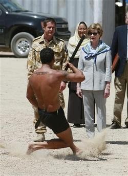 中新網(wǎng)6月0日電 美國(guó)第一夫人勞拉-布什8日突然造訪阿富汗慰問駐軍,勞拉這次前往新西蘭負(fù)責(zé)的重建區(qū)域,新西蘭士兵還大跳毛利人的戰(zhàn)舞歡迎勞拉。與布什看舞蹈會(huì)跟著擺動(dòng)身軀相比,勞拉相對(duì)之下就冷靜得多。