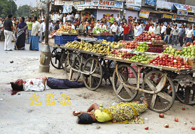 艾哈邁達(dá)巴德市的市集上,兩名遇襲者倒臥在水果檔旁。