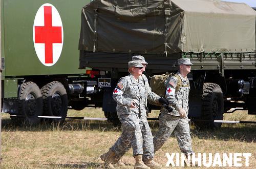 9月4日,在蒙古國首都烏蘭巴托以西65公里處的蒙古國武裝力量培訓(xùn)中心,參加多國維和演習(xí)的美軍醫(yī)療隊(duì)員從軍車旁經(jīng)過。