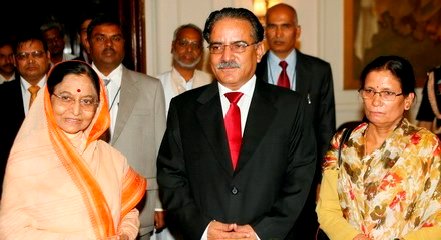 普拉昌達(dá)(中)與妻子(右)會(huì)見(jiàn)印度總統(tǒng)帕蒂爾(左)