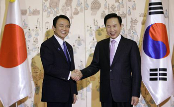 李明博與麻生將于12日舉行會(huì)談。韓國總統(tǒng)府此前說,雙方將重點(diǎn)討論共同應(yīng)對經(jīng)濟(jì)危機(jī),雙邊自由貿(mào)易協(xié)定和朝核問題等。