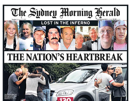 《悉尼先驅(qū)晨報(bào)》認(rèn)為,此次火災(zāi)是澳大利亞最嚴(yán)重的自然災(zāi)害之一,并建議將2009年2月7日作為“國家哀悼日”。他們還將這場火災(zāi)與世界大戰(zhàn)、大蕭條以及巴厘島爆炸案等相提并論。