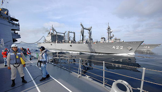 兩艘護(hù)衛(wèi)艦14日從日本廣島縣吳基地出發(fā),28日曾接受依據(jù)新《反恐特措法》在印度洋執(zhí)行任務(wù)的海上自衛(wèi)隊(duì)補(bǔ)給艦的供油。