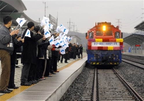 據(jù)悉,該貨運列車由1個火車頭、10節(jié)貨車廂和1節(jié)乘務(wù)員車廂等共12節(jié)車廂組成。在首次運行中將裝載道路界碑和工業(yè)園區(qū)建設(shè)材料等開往朝鮮,返回韓國時則運回開城工業(yè)園區(qū)生產(chǎn)的鞋、衣服和鐘表。