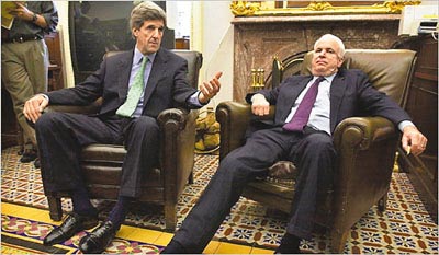 中新網(wǎng)3月25日電 《紐約時(shí)報(bào)》揭發(fā)代表美國(guó)共和黨參選總統(tǒng)的麥凱恩,曾于2000年競(jìng)逐提名失敗后心灰意冷,考慮改投民主黨。2004年大選中,他更派人與民主黨的總統(tǒng)參選人克里會(huì)面,商討要成為對(duì)方的副總統(tǒng),他對(duì)共和黨的忠誠(chéng)成疑。