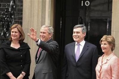 布什夫婦與布朗夫婦在唐寧街10號(hào)門前。