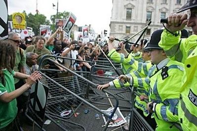 示威者曾計(jì)劃游行到唐寧街,但警察封鎖了通往首相府的白廳街道,并派重兵把守,以確保他們搭設(shè)的金屬路障不會(huì)受到?jīng)_擊。