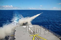 日本海上自衛(wèi)隊的宙斯盾艦“霧島”號在環(huán)太平洋聯(lián)合軍演中發(fā)射防空導彈。