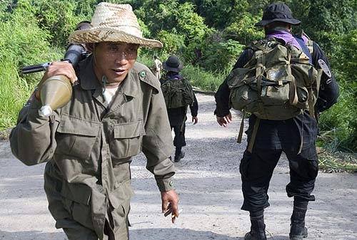 柬埔寨一名士兵攜帶一個(gè)火箭發(fā)射器與泰國的士兵擦身而過。