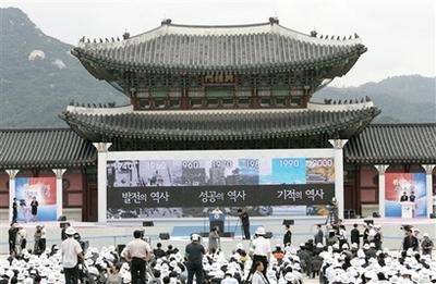 李明博15日在景福宮廣場舉行的光復(fù)節(jié)紀(jì)念儀式上發(fā)表演講。