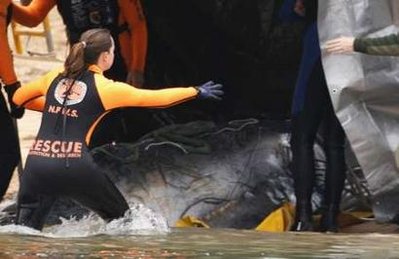 幼鯨被打毒針?biāo)劳龊,由?dāng)局運(yùn)走進(jìn)行解剖。