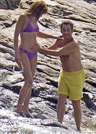 薩科齊夫婦當(dāng)時(shí)正在法國里維埃拉的家庭別墅度假。照片中的布呂尼身穿一件紫色比基尼,53歲的薩科齊則穿著一件黃色泳褲,他親吻了布呂尼并溫柔地?fù)崦紖文岬母共俊?/p>