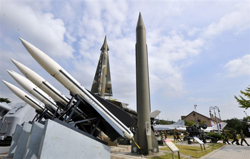 10月8日,韓國軍人在朝鮮戰(zhàn)爭紀念館展示的朝鮮導彈模型前走過。韓國媒體報道稱朝鮮7日發(fā)射了短程導彈。