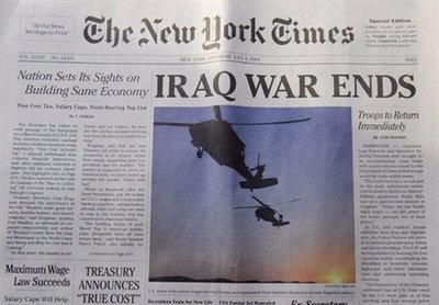 一個專門開展惡作劇活動的美國組織12日印刷了120萬份偽造的《紐約時報》。這份堪稱“惡搞杰作”《紐約時報》共有14版,無論是報頭還是字體字型,都和真正的《紐約時報》一模一樣,乍看上去簡直真假難辨。不過,這份報紙標(biāo)明的出版時間為2009年7月4日,其頭條竟然是:伊拉克戰(zhàn)爭結(jié)束了。