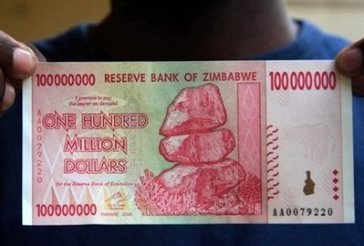 這是津巴布韋今年內(nèi)第29次靠發(fā)新鈔來追趕通貨膨脹和舒緩貨幣短缺問題。津巴布韋剛在上周四發(fā)行面值1億津巴布韋元的鈔票,當(dāng)時的實(shí)值是14美元;可是一星期后,兌換率只有0.5美元。