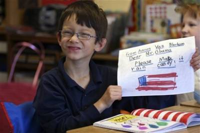 即使不是現(xiàn)實(shí)的復(fù)雜議題,小孩異想天開(kāi)的古怪愿望,奧巴馬要實(shí)行起來(lái)亦不容易。7歲的阿龍就寫道:“請(qǐng)令天空下糖果雨!”另有兒童希望奧巴馬讓全球兒童放假一天,又有兒童畫了一個(gè)地球,命名為“奧巴馬樂(lè)園”。