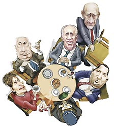此外,現(xiàn)場也展出多幅諷刺時(shí)局的政治漫畫,包括有個(gè)小孩從本拉登的招牌長胡須中探出頭,以及以色列首相奧爾默特請辭,各主要政治領(lǐng)袖間合縱連橫的姿態(tài),經(jīng)漫畫家的詮釋,呈現(xiàn)諷刺的喜感。