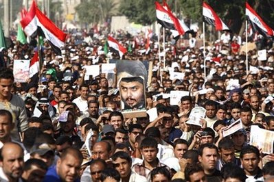 抗議者揮舞著伊拉克旗幟和綠色的什葉派標(biāo)牌,齊聲喊道:“不,不要美國的協(xié)議!”和“不,不要喪權(quán)辱國之約!”