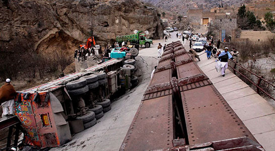 武裝分子多用火箭筒或者沖鋒槍來(lái)偷襲毫無(wú)自衛(wèi)能力的普通大貨車(chē),很多卡車(chē)司機(jī)因此拒絕為北約盟軍運(yùn)送后勤物資。去年12月,白沙瓦附近的貨場(chǎng)遭塔利班襲擊,共有300多輛大貨車(chē)被燒毀。由于這條補(bǔ)給線常遭塔利班襲擊,美國(guó)和北約希望能開(kāi)辟?gòu)闹衼嗊M(jìn)入阿富汗的北線來(lái)運(yùn)輸燃料和食品等物資。