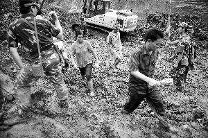 負(fù)責(zé)挖掘的武警交通直屬工程部的周偉表示,為了確保安全,避免次生災(zāi)害,大型挖掘機(jī)的挖掘工作到下午四點(diǎn)左右才開始。他說,為了保證遺體的完整,他們挖掘的時(shí)候都會(huì)非常小心。在現(xiàn)場(chǎng),由于垮塌的直線距離幾百米,幾臺(tái)挖掘機(jī)分層次挖掘。挖出一大鏟泥土后,從高處落下,看是否有遺體存在。
