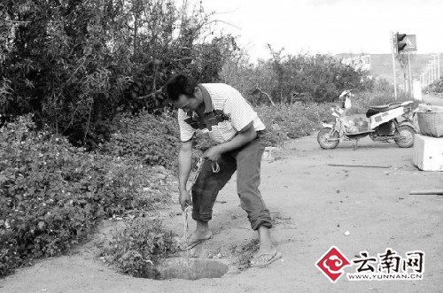 昨日下午,蒙自縣文瀾鎮(zhèn)高家寨的戴橋紅,正拎著一只水桶在紅河大道上找水,他找水的地方是紅河大道上的排污管道。在紅河大道的非機動車道上,許多窨井蓋都不見了,紅河大道兩旁的果農們,每天都會開著車或者騎著摩托來找水。