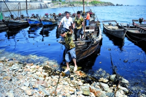 昨日,在大連港事故現場的海面上,十多艘海事清污船正在作業(yè)。當天的清污工作主要由海事部門組織,大連軍分區(qū)派出1100名官兵、200名民兵參與清理。