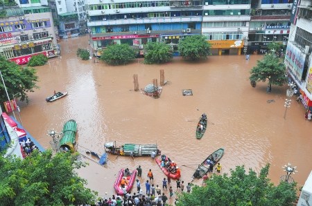 截至昨晚7點(diǎn)半,途經(jīng)達(dá)州城區(qū)的洪水水位已達(dá)到282.61米,超過警戒水位4.7米,洪水使整個(gè)達(dá)州城超過1/3的面積進(jìn)水,濱河路淹到二樓,全城大面積停水,逾5000家門市的貨物轉(zhuǎn)移。達(dá)州河市機(jī)場也進(jìn)水。