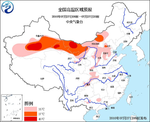 中央氣象臺7月27日06時繼續(xù)發(fā)布高溫藍色預警: