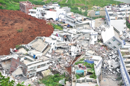 然而集鎮(zhèn)背后,高聳的大山被生生拉了一條“傷痕”——灰色的土石從山腰傾瀉而下,一直拉到集鎮(zhèn)的邊緣。土石經(jīng)過(guò)的地方,所有的民房都被埋了進(jìn)去。集鎮(zhèn)上靠近山坡的房屋,也有許多未能幸免;虮宦瘛⒒虻顾、或傾斜,剛剛建起的新房成了廢墟。經(jīng)歷過(guò)“5·12”特大地震的當(dāng)?shù)厝苏f(shuō),這些房屋的樣子和地震沒(méi)什么兩樣。