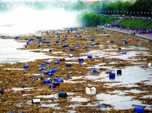 記者下午在吉林市城區(qū)內(nèi)的一處松花江段看到,江面上漂浮著幾十個藍(lán)色的原料桶,江邊異常的氣味不太明顯。