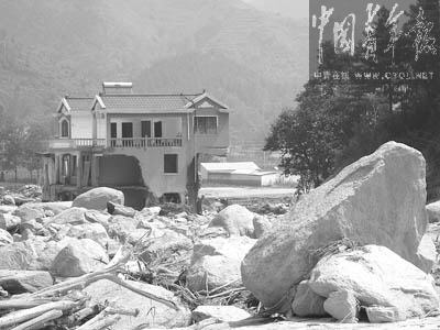 洪水淹沒了?吭诼愤叺钠,沖開了臨街五金店、超市、移動營業(yè)廳的鐵門……