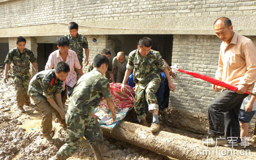 從早上到晚上,官兵們餓了就吃一口火腿腸,渴了就喝一口礦泉水,渾濁的江水打濕了官兵的衣衫。官兵們在淤泥里行走十分困難,每走一步都要付出很大代價,迷彩服上甩滿了泥水。街面上是近一米深的湍流的江水,阻擋了進城和出城的腳步。一邊是回鄉(xiāng)心切的群眾和焦急等待進入現(xiàn)場的救援官兵,一邊是遇難者遺體等待運出城外。大型挖掘機的車斗成了擺渡車,四級警士長賈政學駕駛著挖掘機,在近400米的街面上來回穿梭,把一拔一拔群眾擺渡出安全地帶,根本就沒有時間休息和吃飯。
