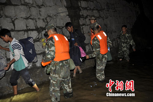 時間在一分一秒的過去,廖軍支隊長果斷下令,全體救援官兵穿著救生衣深入事故地段排成一條直線,由推土機的反斗將被困群眾載運到臨時通道的安全地帶,隨即救援官兵通過攙扶、背負、肩扛等方式將被困群眾引導到河水上游的安全處。